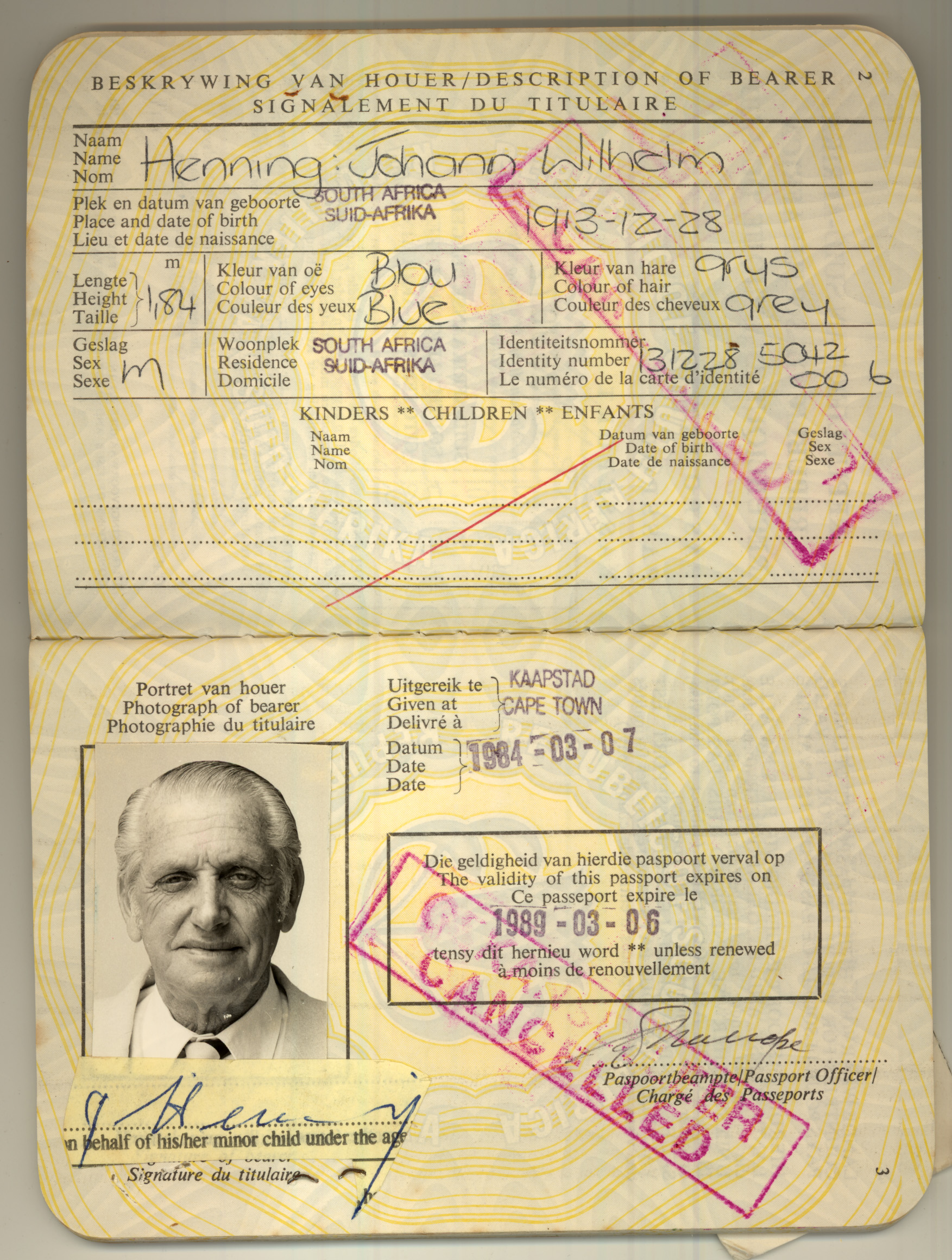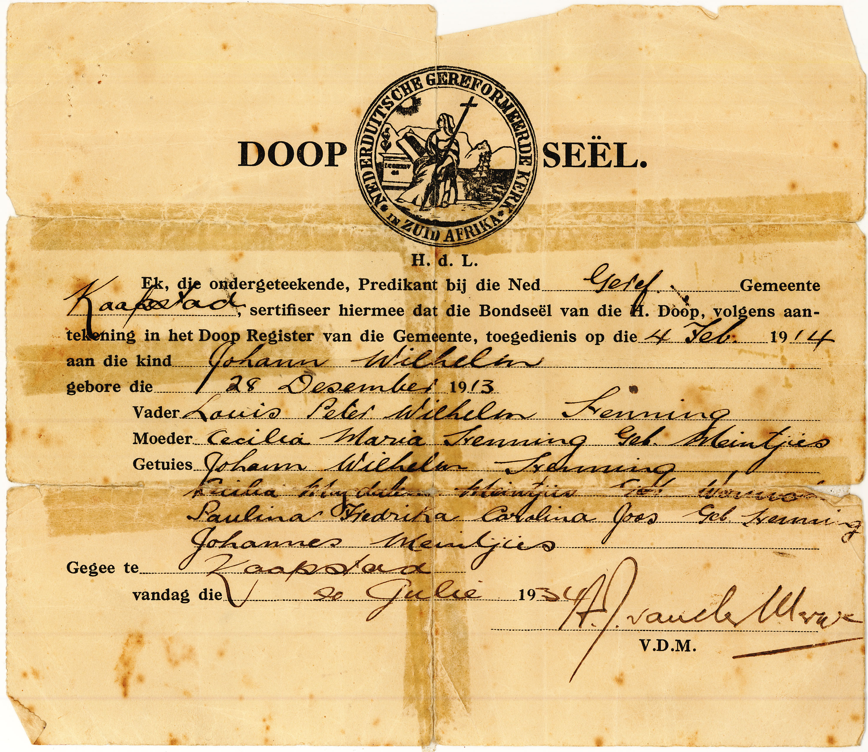 Johann Wilhelm Henning baptism certificate 1913