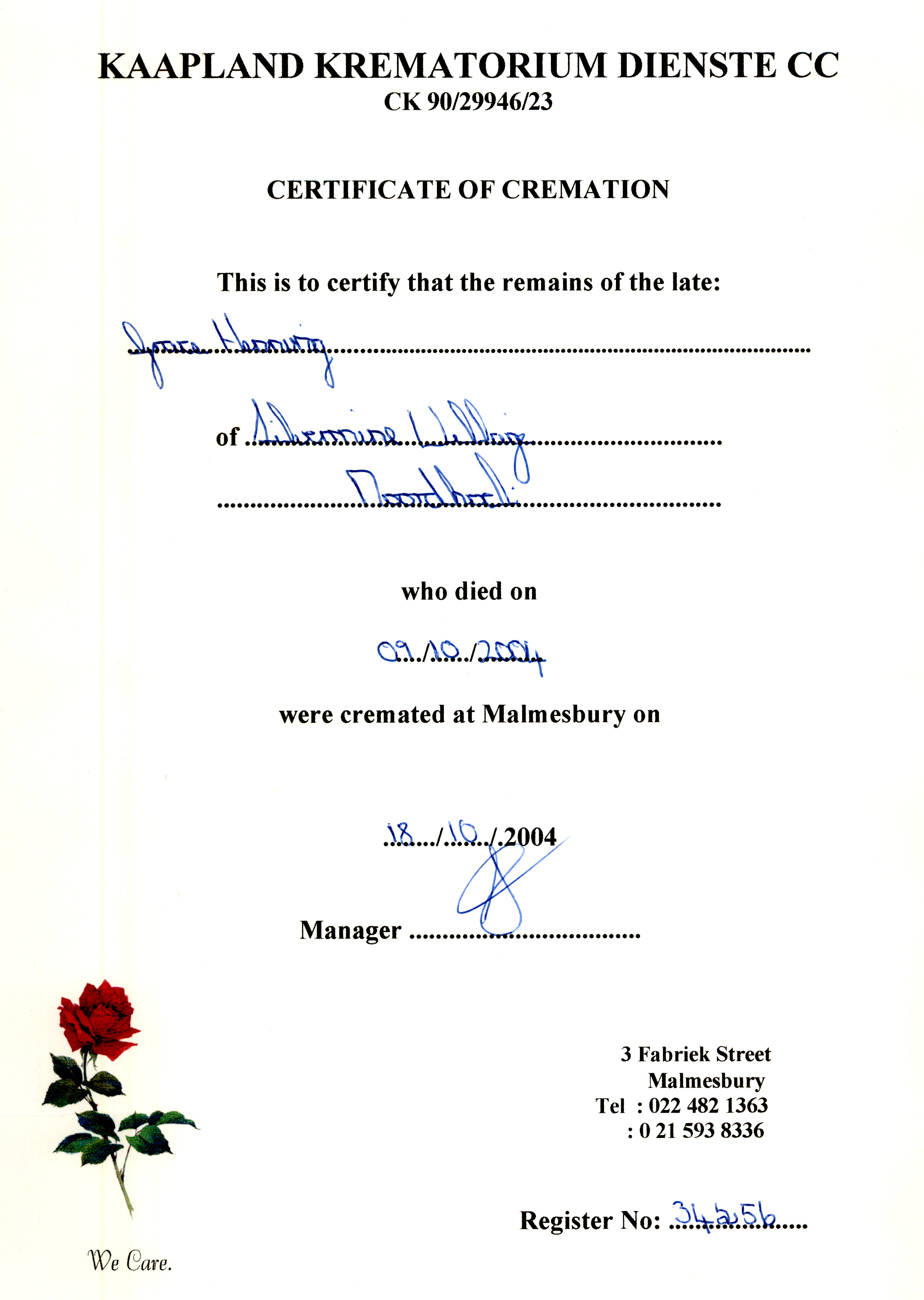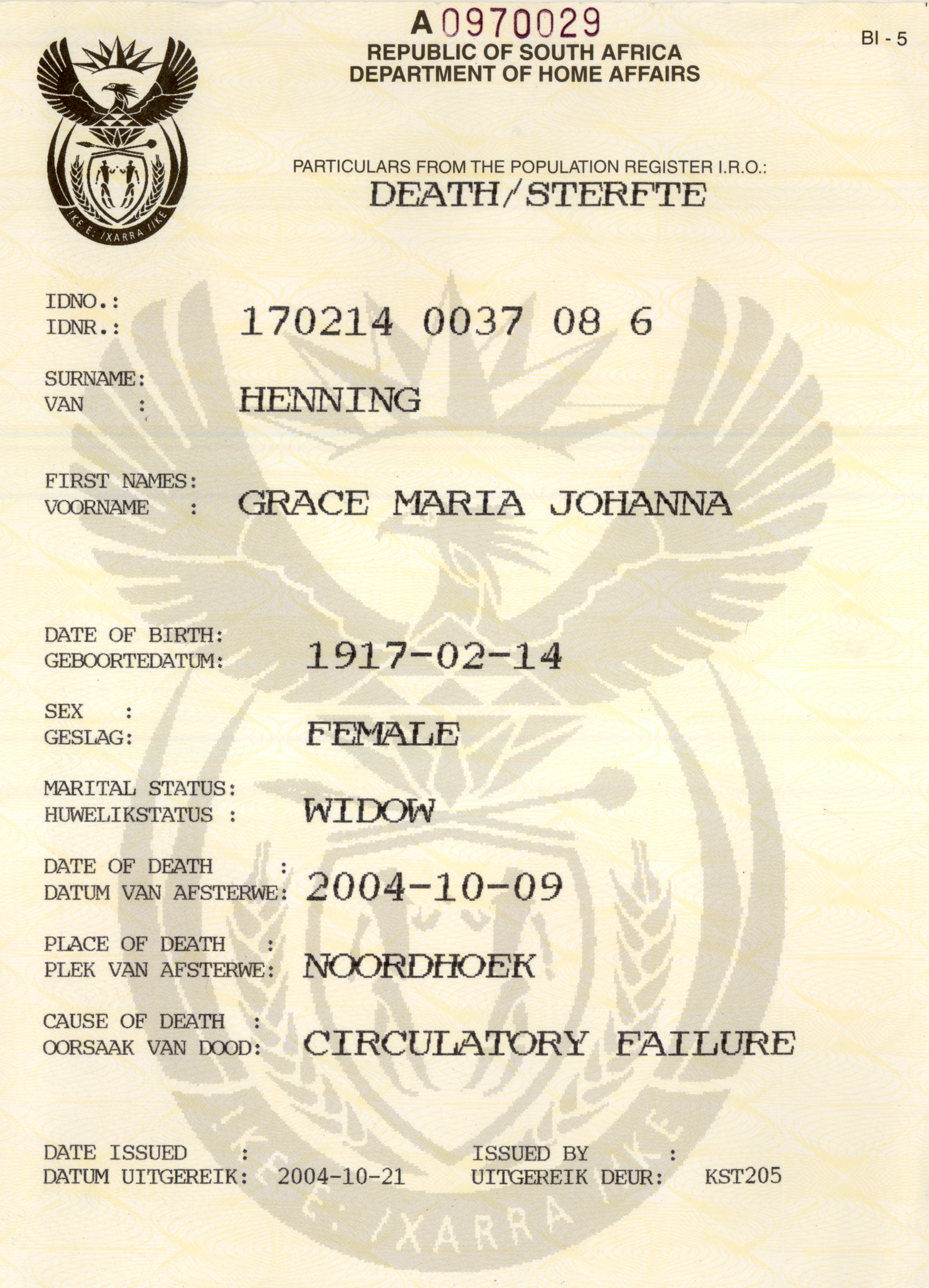 Grace - death certificae