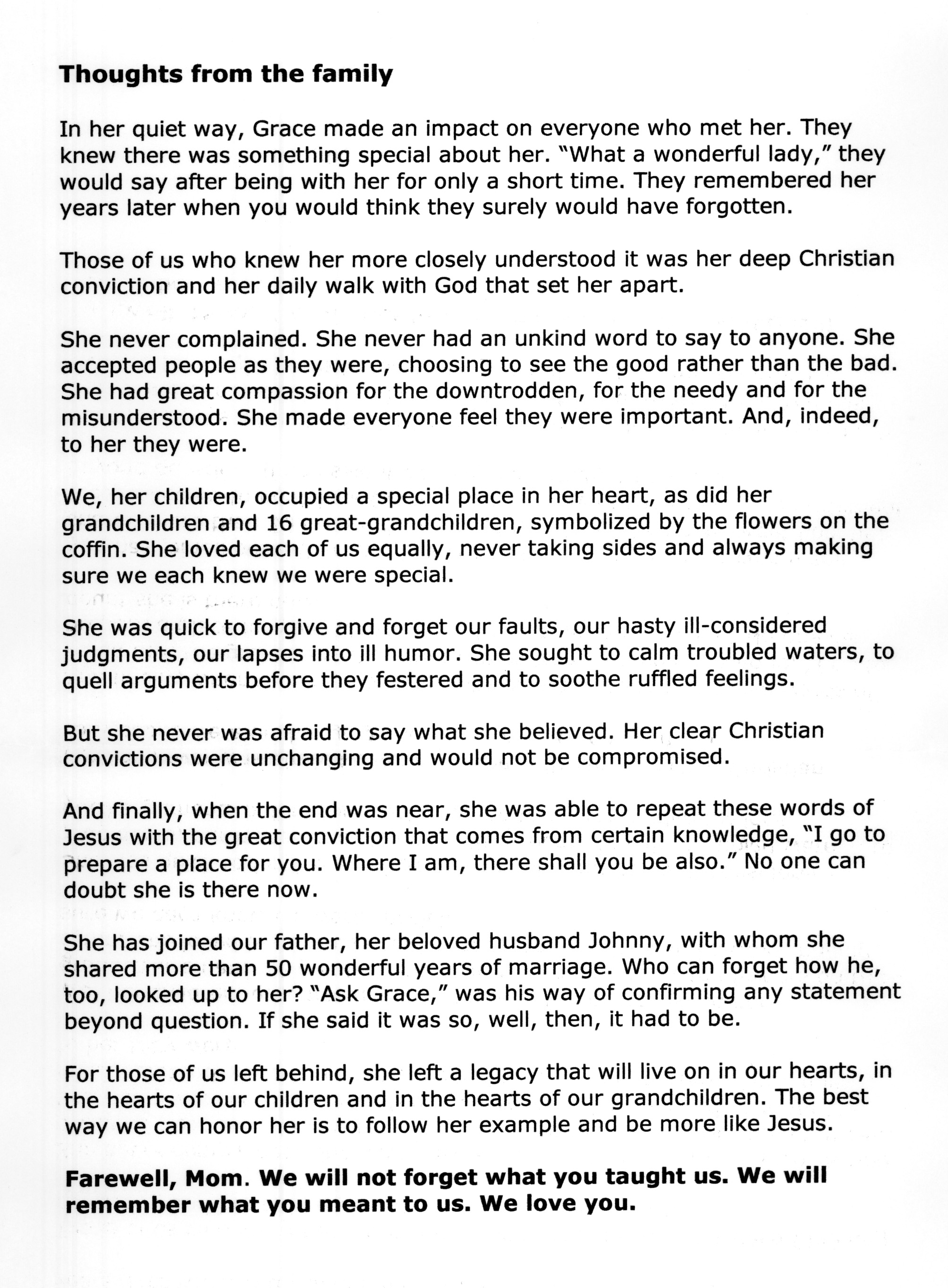 Family thoughts on Grace's passing