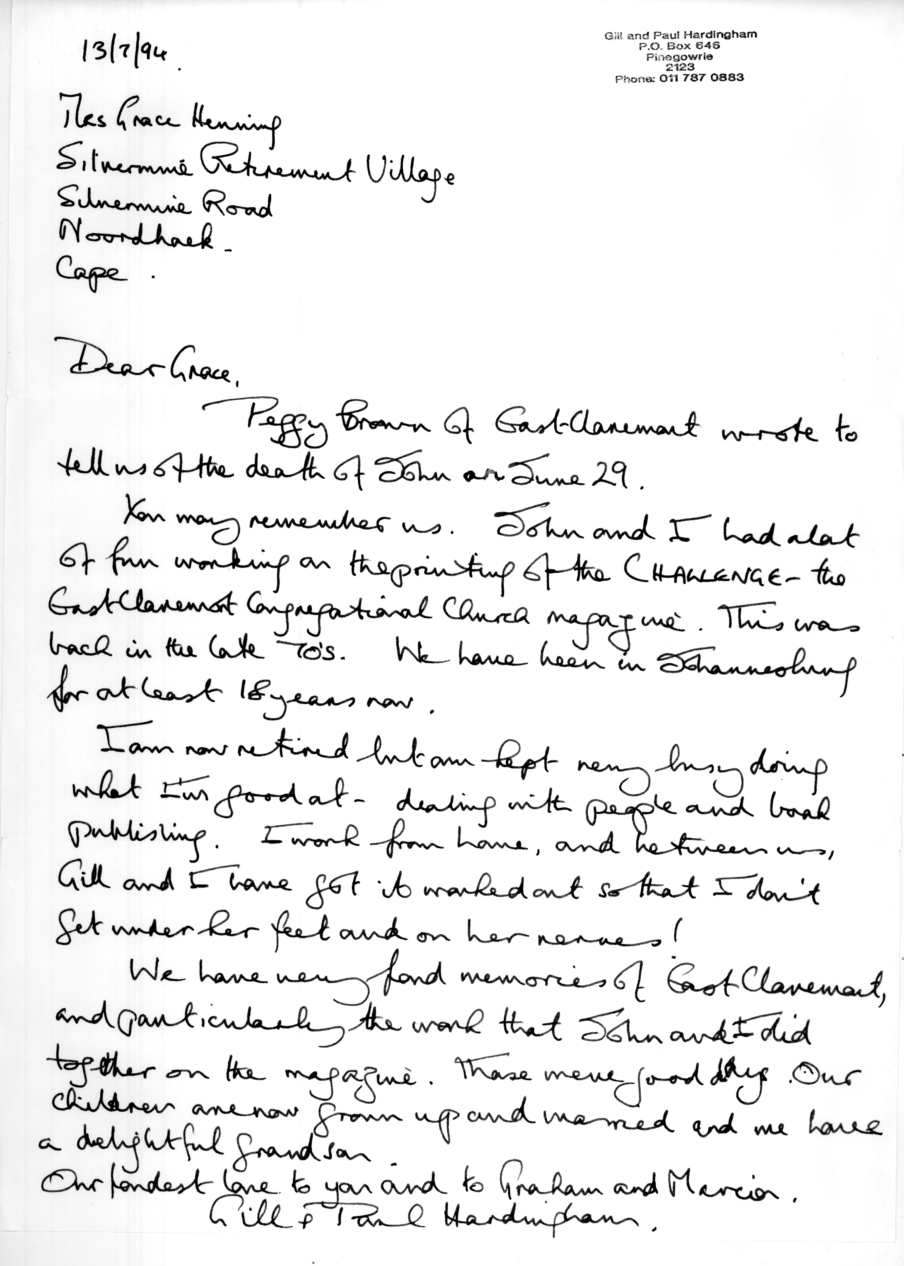 Hardingham letter on Johanny's death