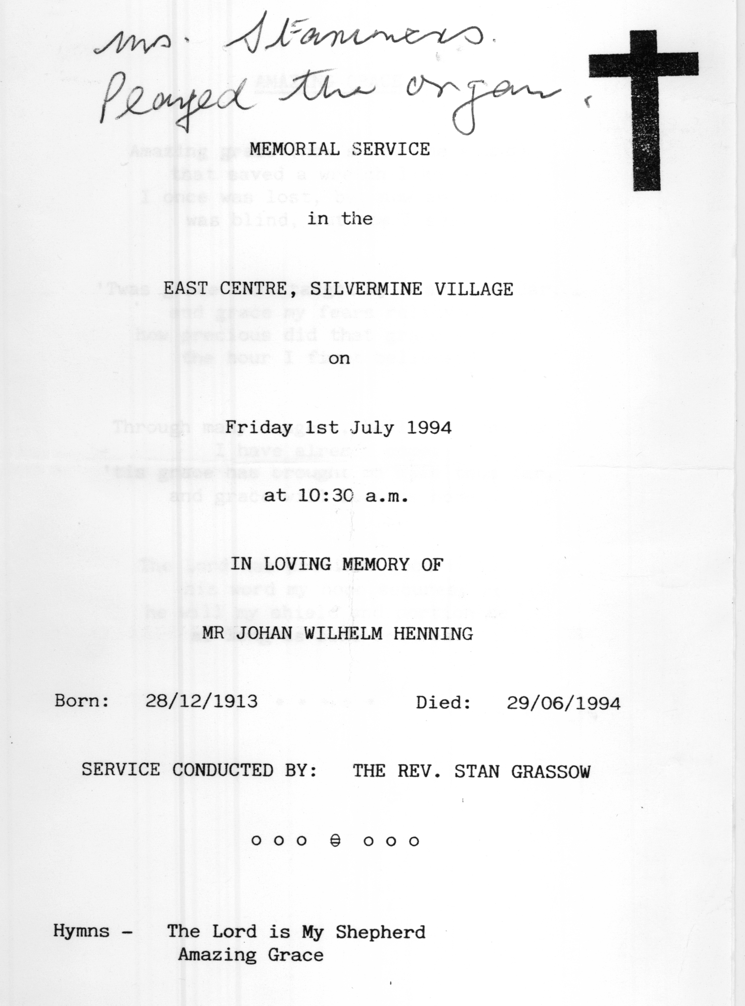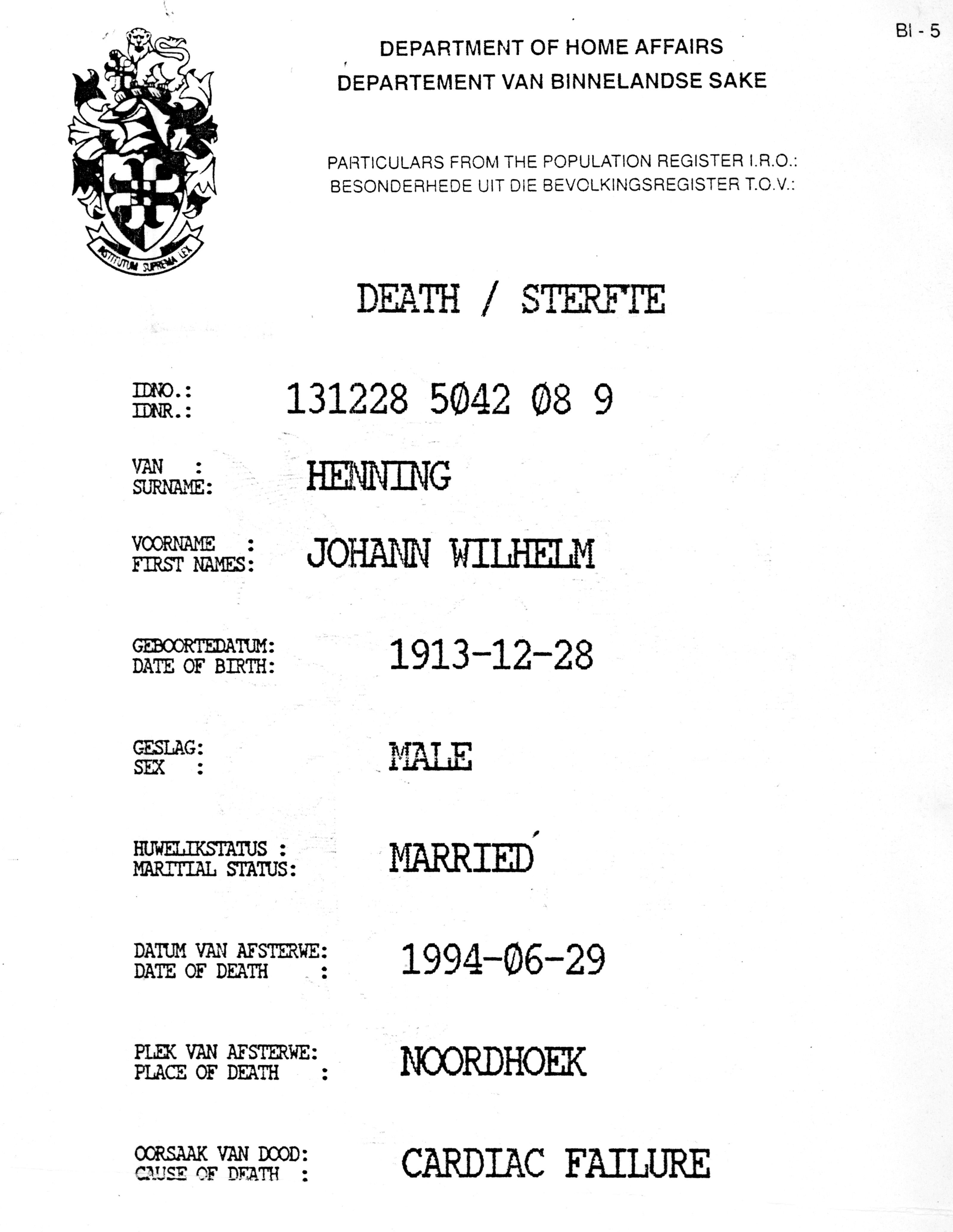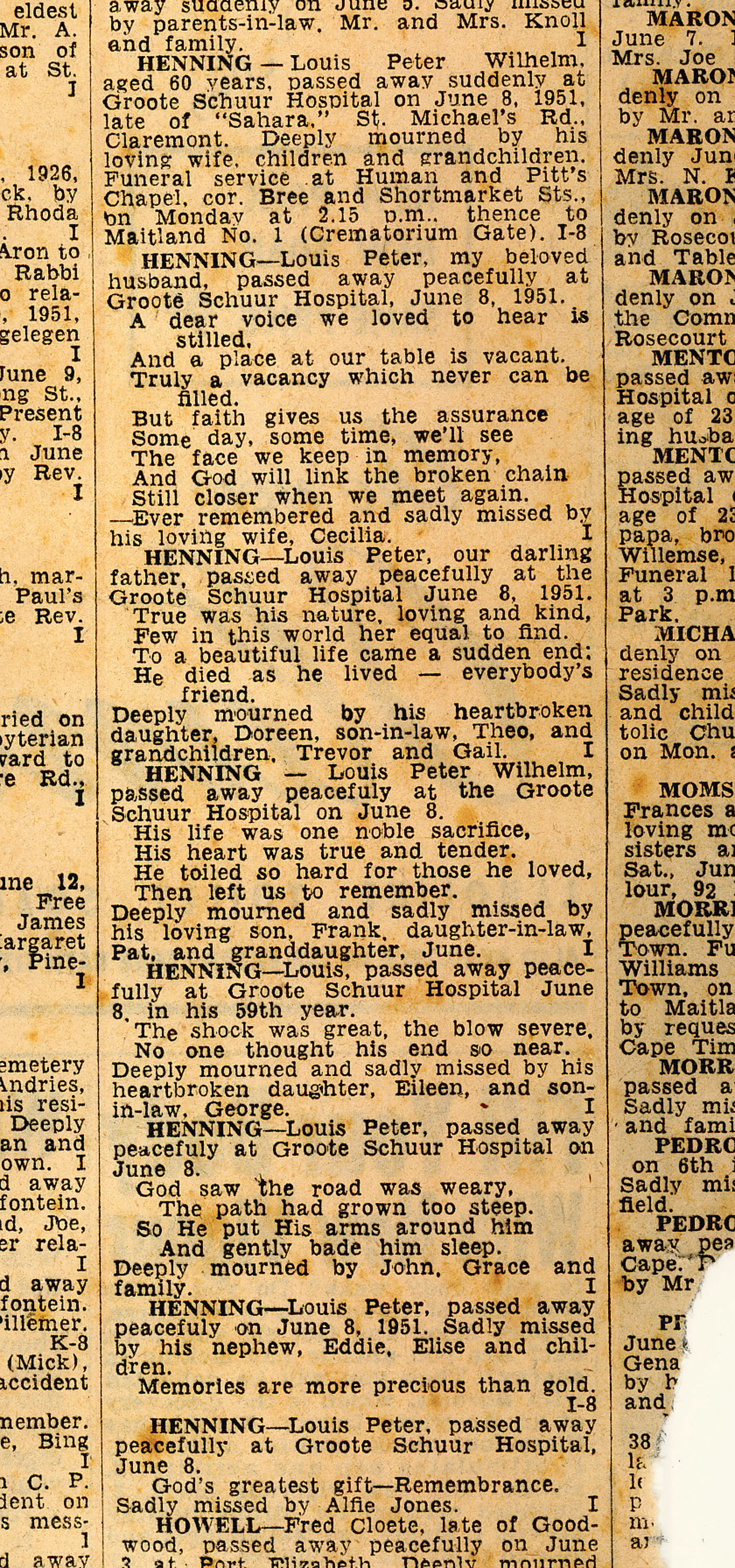 Louis Peter Wilhelm Henning death notices 1951