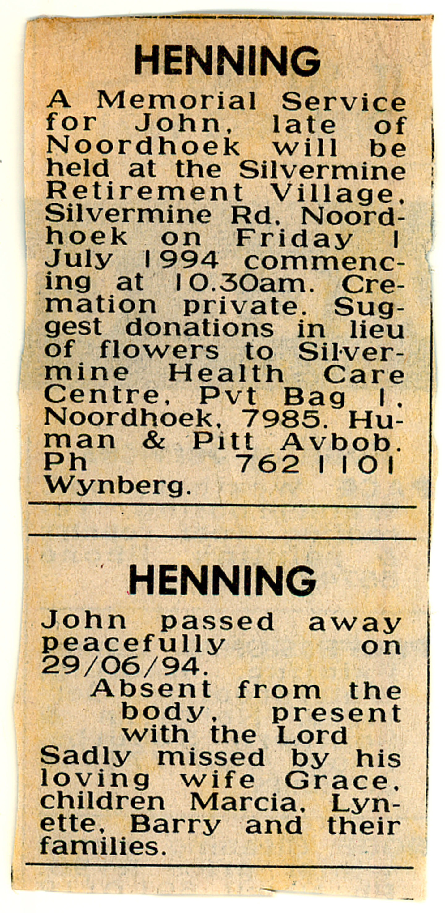 Silvermine letter on John's death