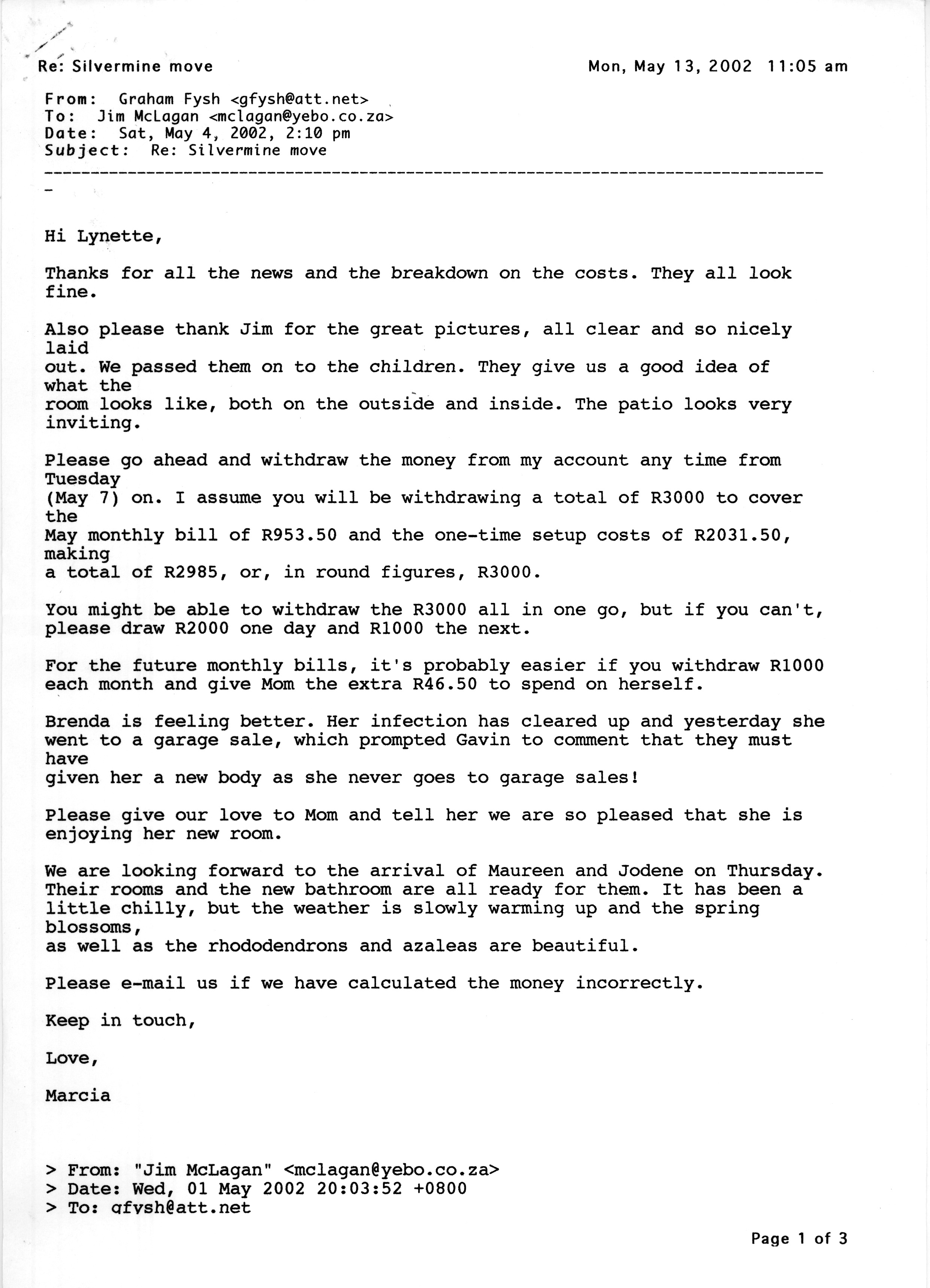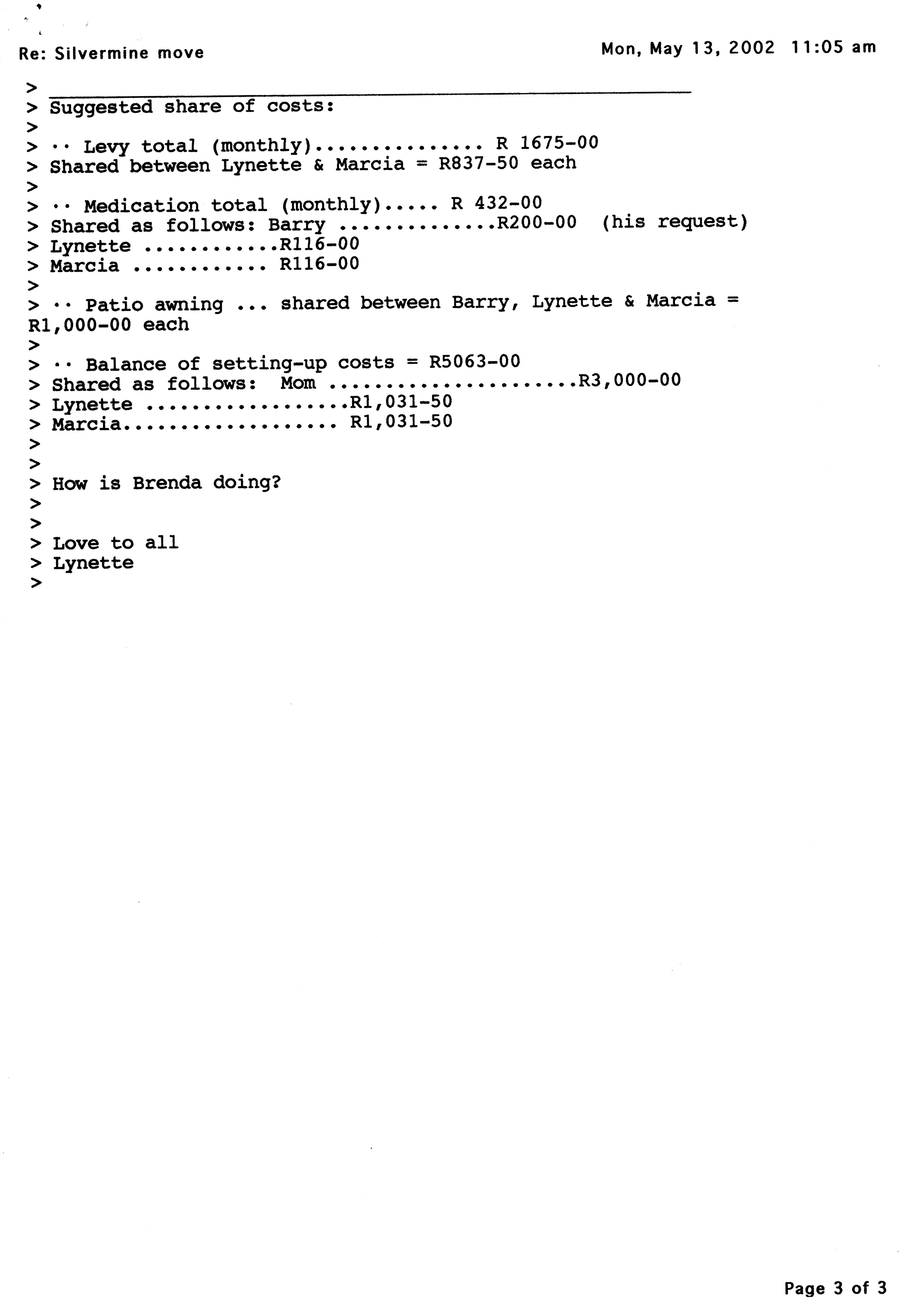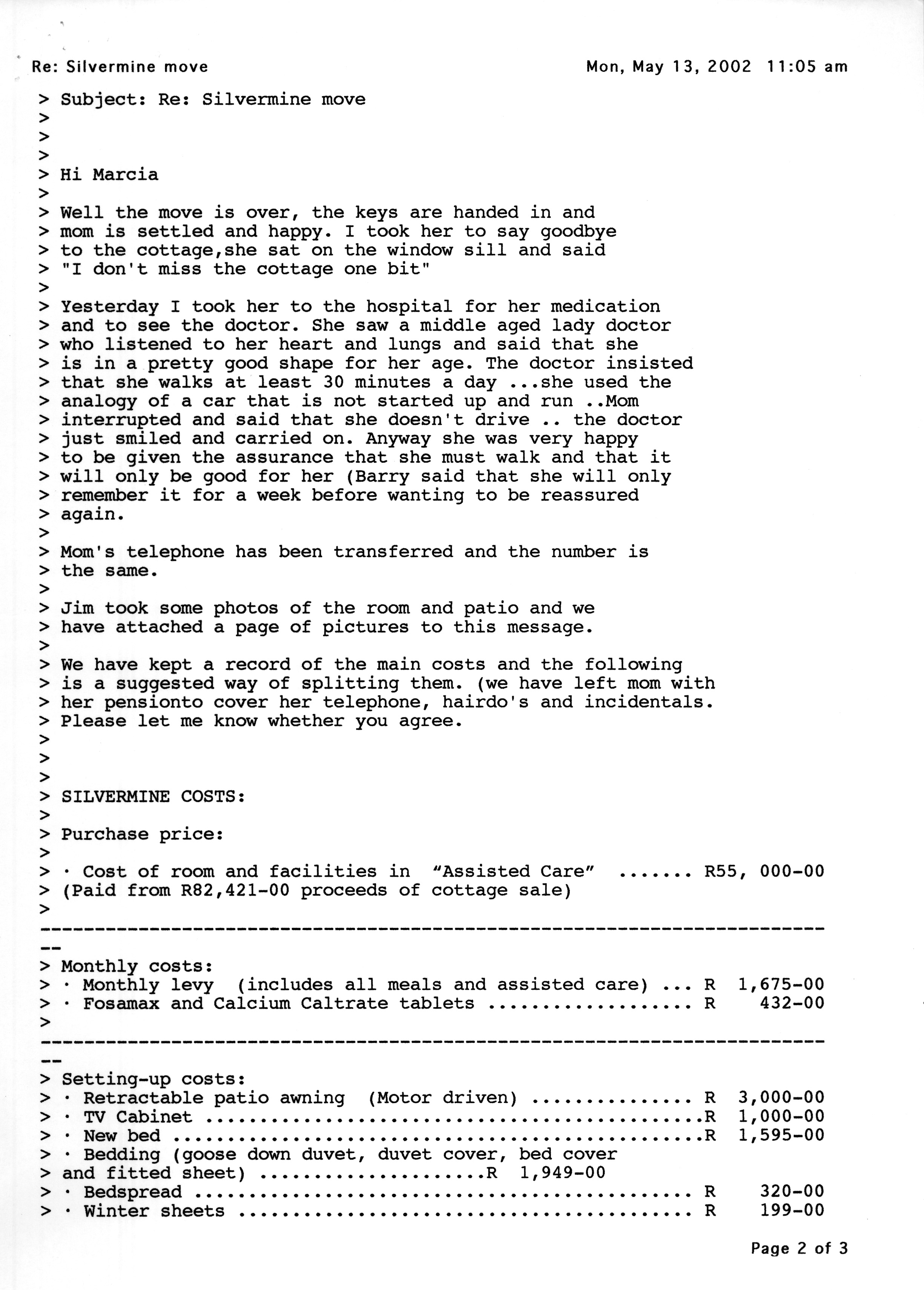 Email from Marcia to Lynette n Silvermine costs - 1