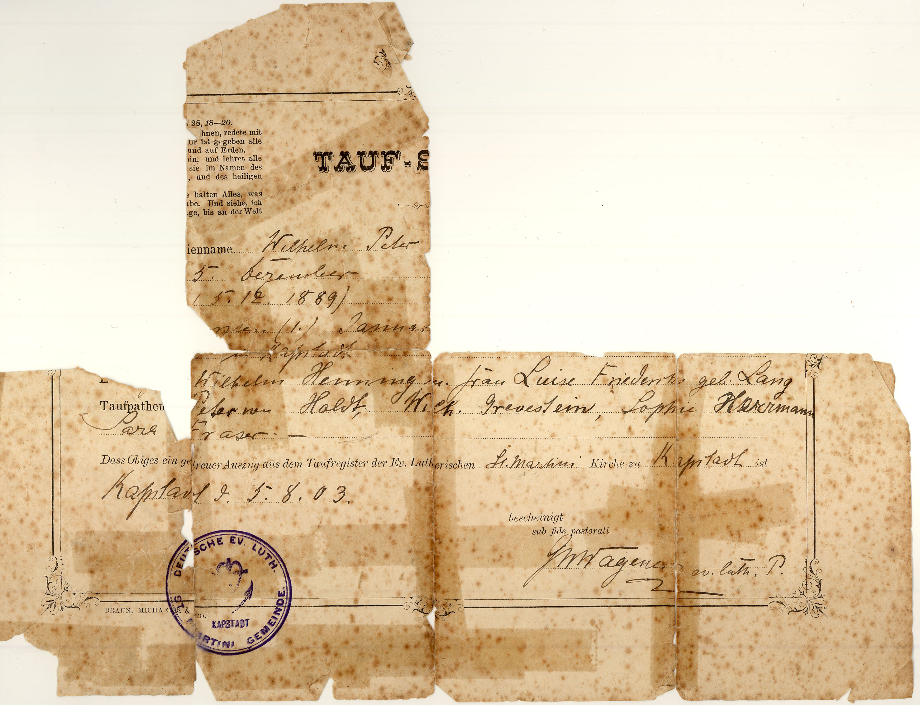 Christening certificate - Wilhelm Peter Henning- 1903