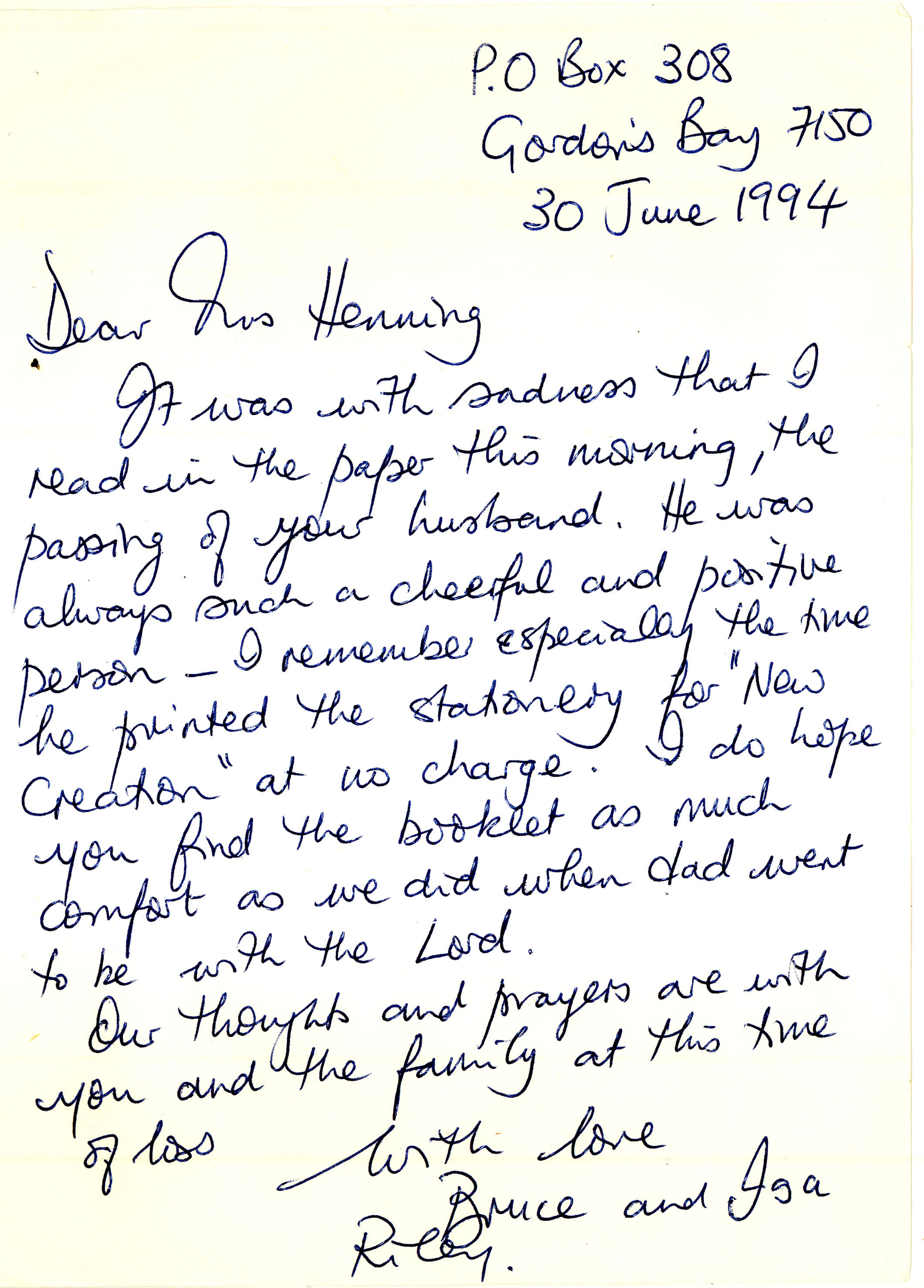 Letter from Isa Riley on John's death