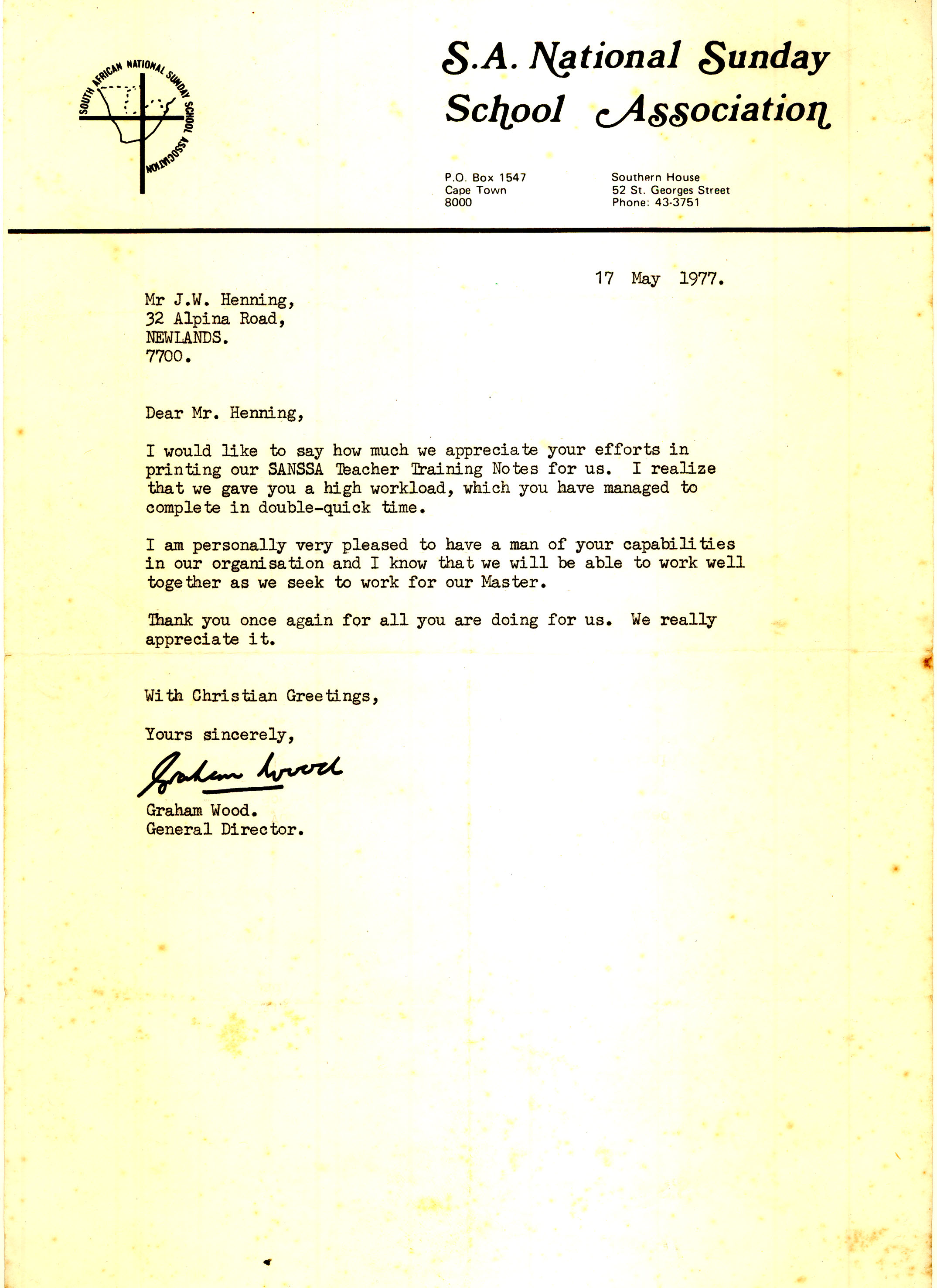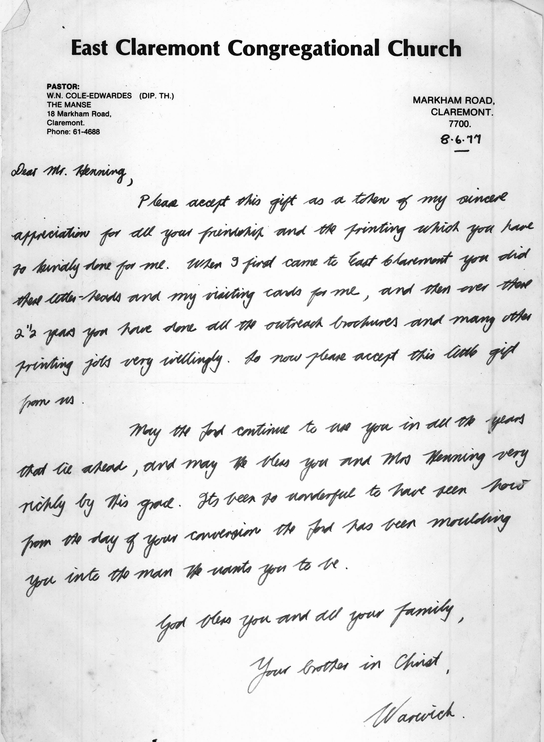 Letter from Warwich thanking John 1977 -1