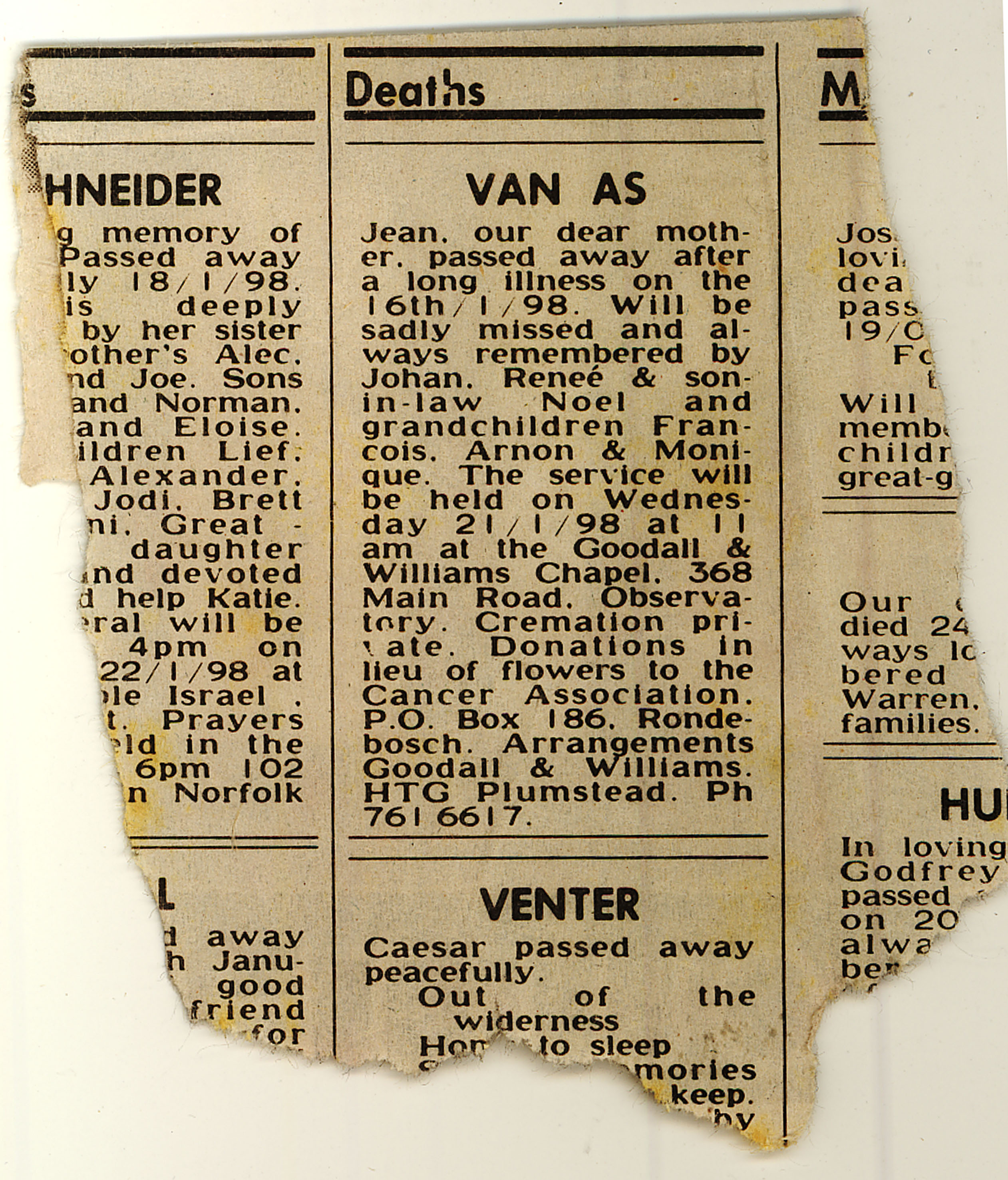 Jean van As death notice 1988
